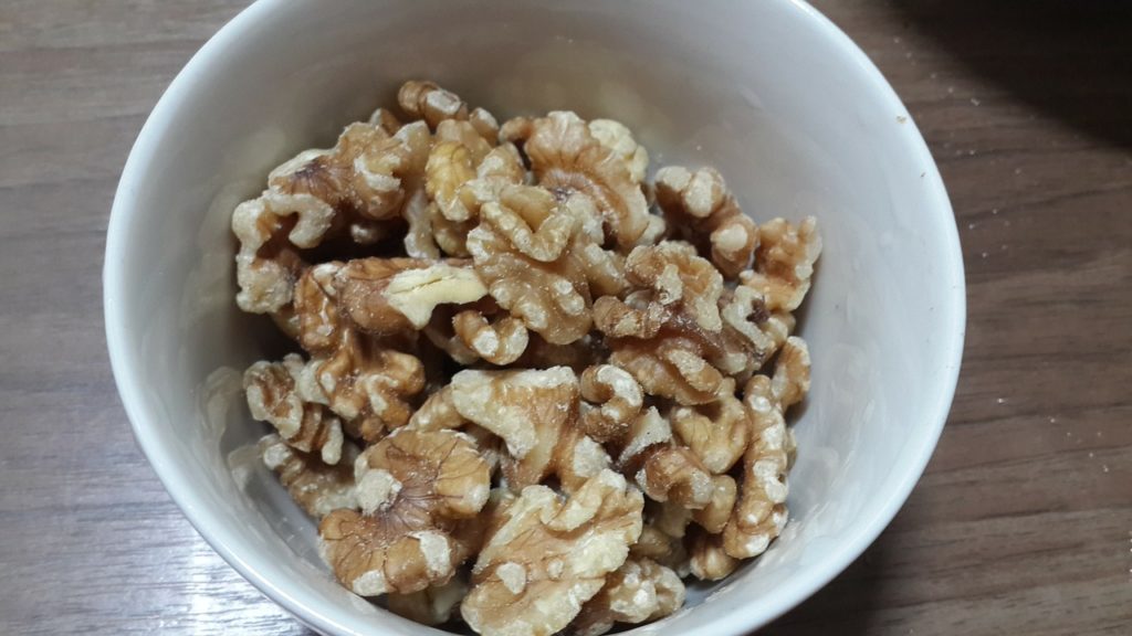Jajko, rozmrożone wiśnie i posiekane orzechy włoskie dodaj do miski.