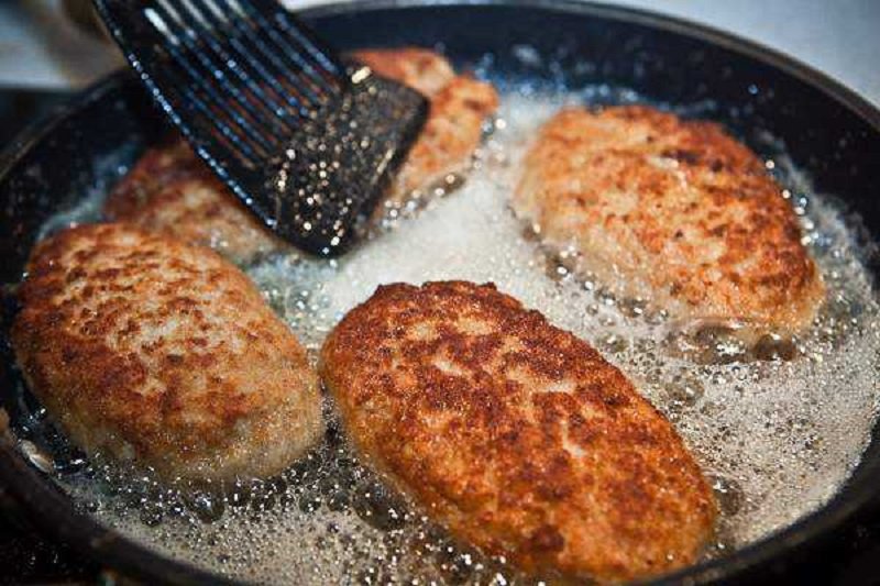 Na patelni rozgrzać olej. Zamrożone kawałki mięsa smażyć na niej po kilka minut, ale pamiętając, że z każdej strony. Skórka kotleta powinna być złota. Usmażone kotlety przełożyć na blachę do pieczenia.