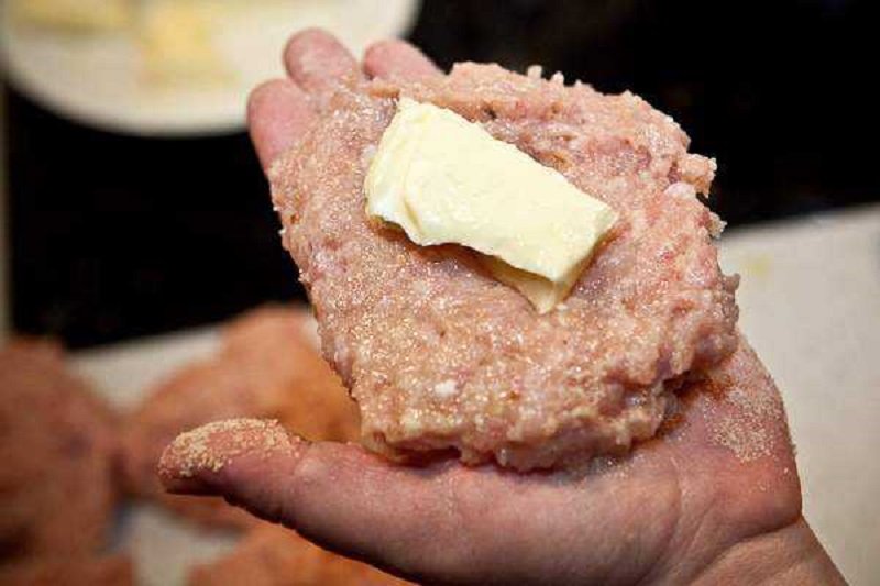 Miękkie masło należy pokroić na identycznie wielkościowo kawałki. Zaleca się, aby były one jednak podłużne. Z jednego kawałka mięsa uformować niewielki placek. Jeden kawałek pokrojonego masła umieścić na środku tego placka.