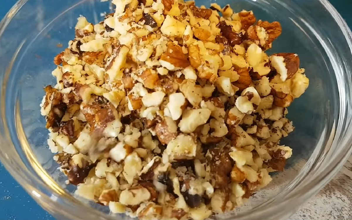 Włóż ciasteczka do woreczka i zmiażdż je na małe okruchy. W ten sam sposób zmiażdż orzechy włoskie
