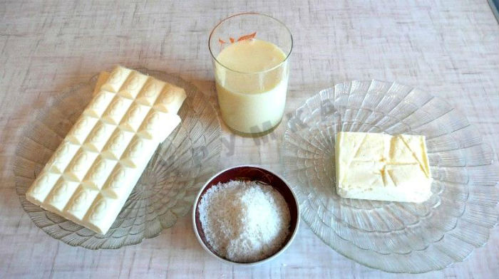 Do garnka włóż masło i połamaną czekoladę – mieszając rozpuść je na małym ogniu. Dodaj do nich mleko i dokładnie wymieszaj, a na końcu wsyp wiórki kokosowe i całość ze sobą połącz.