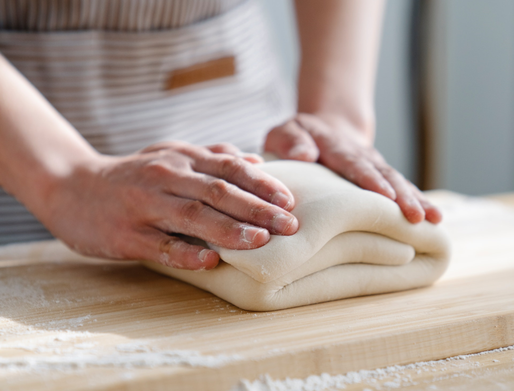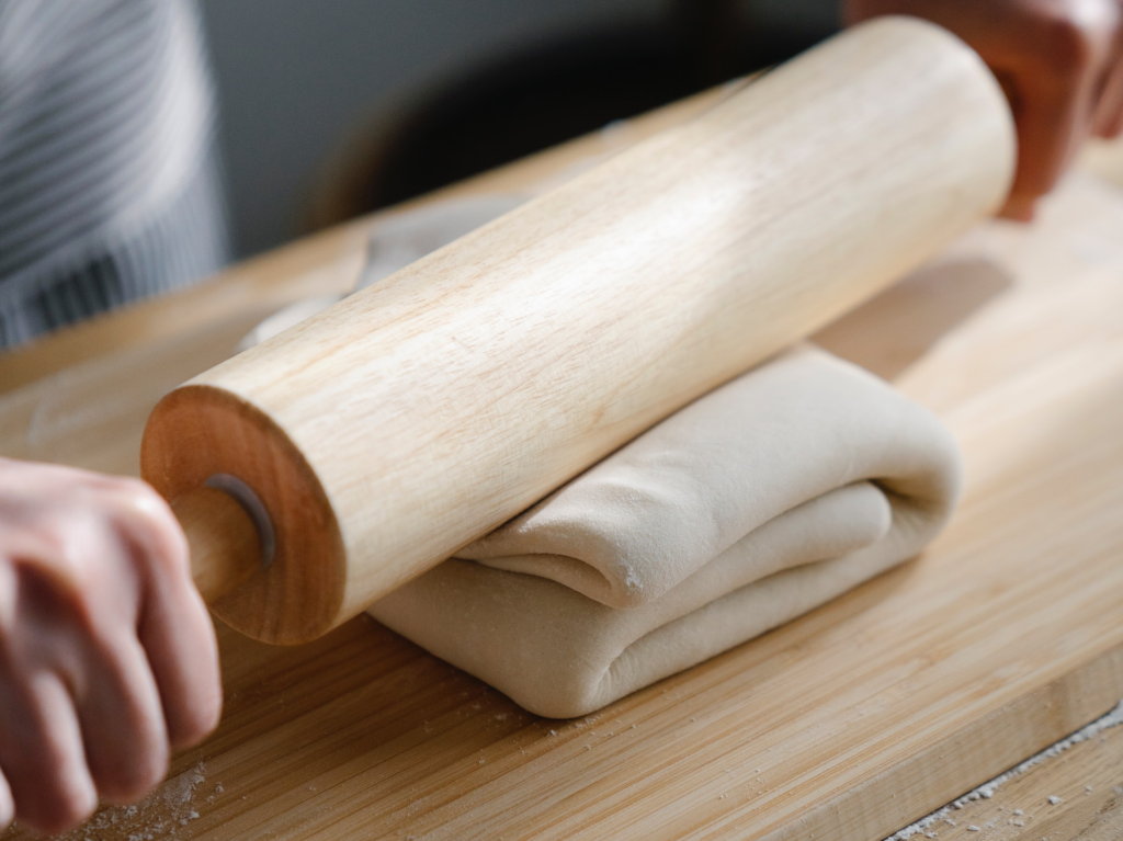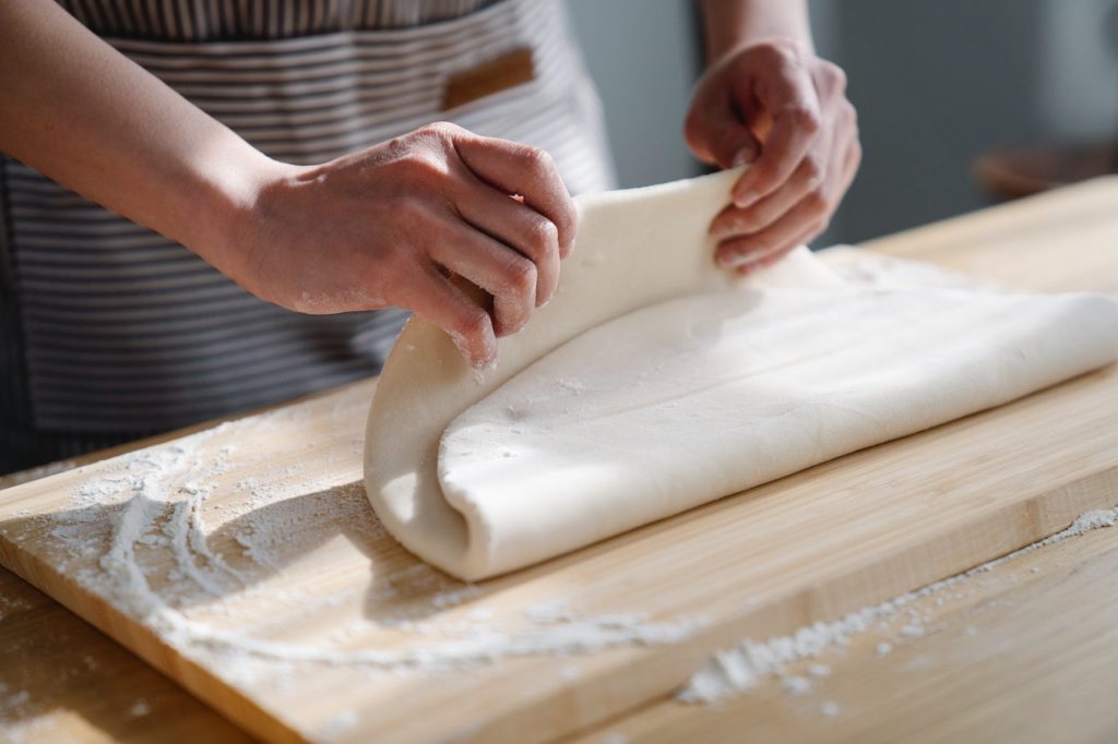 Rozwałkuj jedną część na dużym prostokącie za pomocą wałka. Posmaruj powierzchnię roztopionym masłem i zawiń w trzy warstwy. Powtórz smarowanie masłem i ponownie zawiń w trzy warstwy.