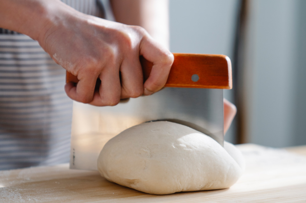 Przenieś wyrośnięte ciasto na posypaną mąką powierzchnię, oprósz mąką i zagnieść. Podziel ciasto na pół.