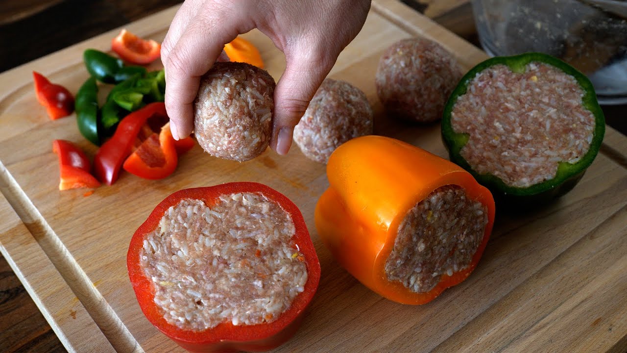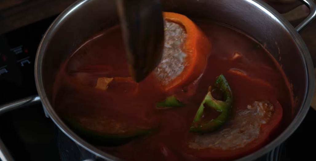 Odetnij górne części papryk i usuń nasiona ze środka. Napełnij każdą paprykę przygotowanym farszem mięsnym z ryżem. Umieść faszerowane papryki w garnku i dodaj 125 g koncentratu pomidorowego. Zalej papryki wodą, tak aby były częściowo zanurzone. Gotuj na średnim ogniu przez około 30 minut, aż papryki zmiękną, a farsz będzie dobrze ugotowany.