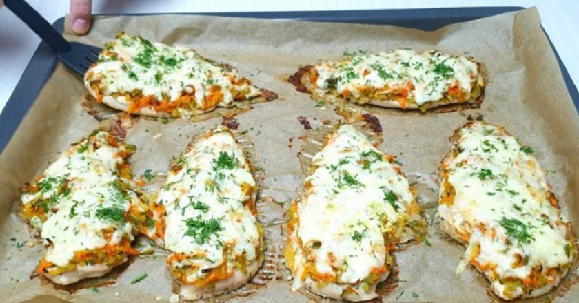 Jedną z moich ulubionych opcji obiadowych jest filet z kurczaka pod płaszczem warzywnym. Tutaj masz cebulę i marchewkę, ogórki kiszone i serowy kapelusz, który nigdy nie jest zbyteczny. Jako dodatek podaję tłuczone ziemniaki lub gotowany ryż.