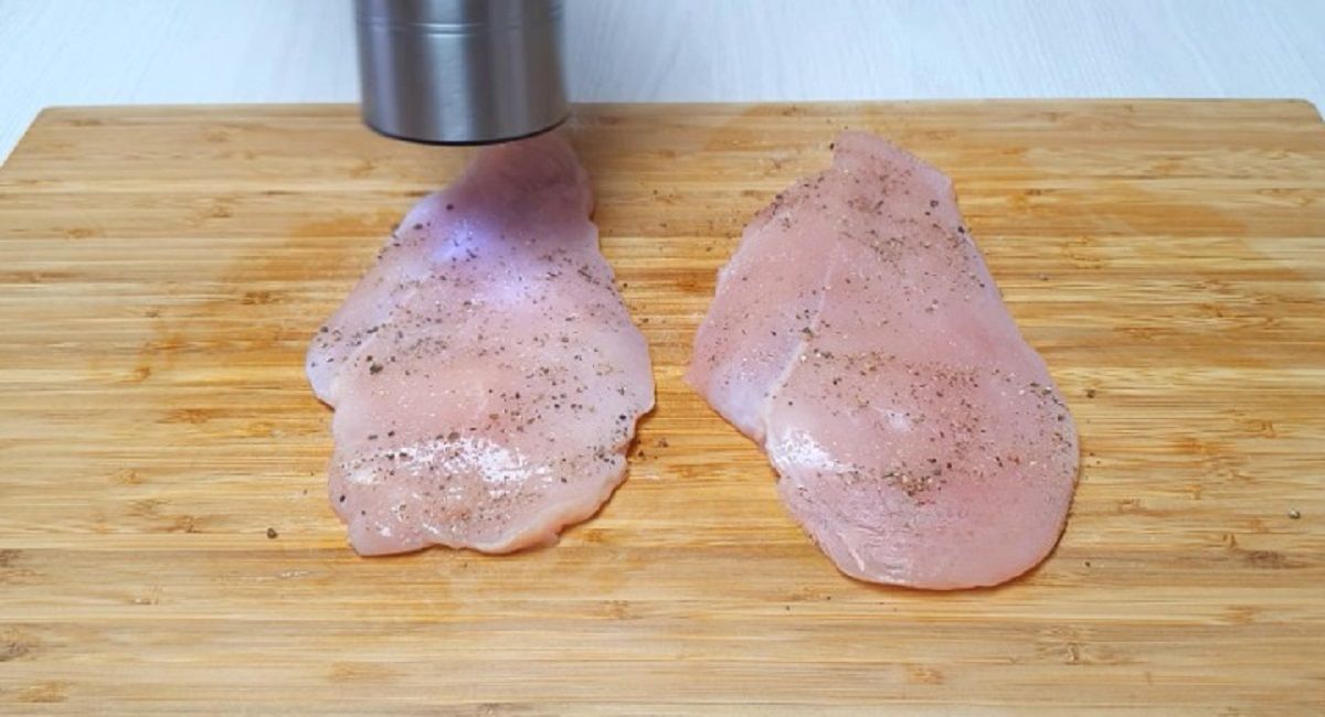 Pokrój każdy filet wzdłuż i odetnij kawałki, przykrywając je folią spożywczą. Dopraw mięso z obu stron suchym czosnkiem, solą i pieprzem. Połóż filet na blasze wyłożonej pergaminem.