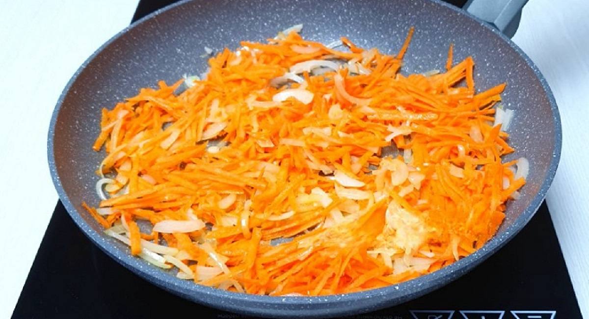 Cebulę pokroić w ćwiartki krążków, a marchewki zetrzeć na grubej tarce. Warzywa podsmażyć w niewielkiej ilości oleju słonecznikowego.