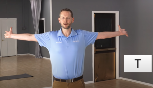 Na koniec, podnieś ręce do pozycji „T”, podnosząc całe ręce na wysokość barków. Nie podnoś ramion, dłonie skierowane do przodu, zdejmij klatkę piersiową i przyciągnij łopatki do siebie. Wstrzymaj na 2 oddechy i zwolnij.