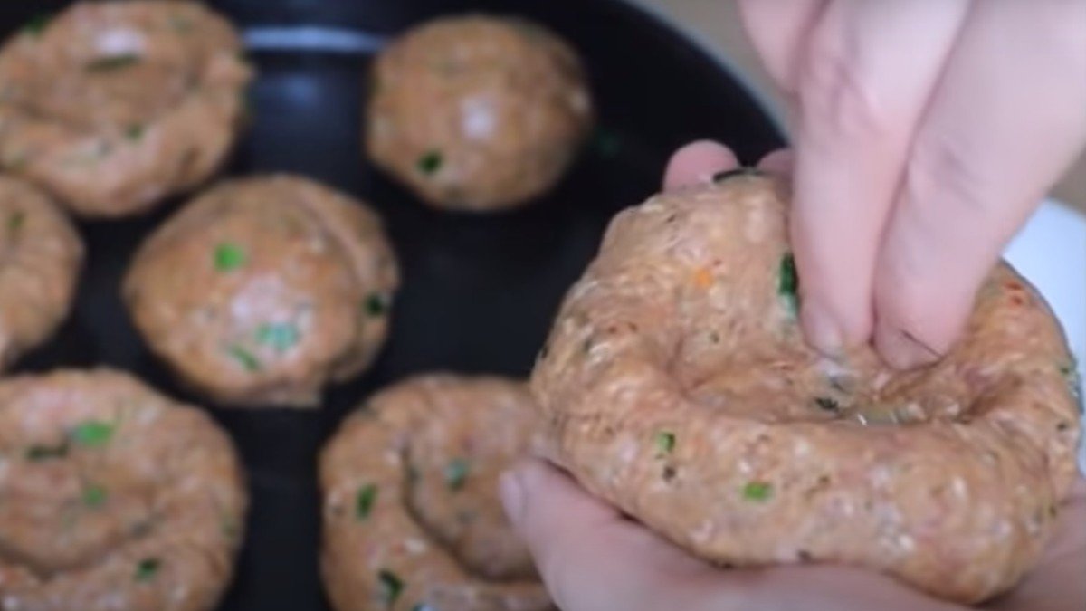 Ręce posmarować olejem roślinnym i kawałkami odrywać masę mięsną. Każdy z nich zwinąć w kulkę i układać kolejno na blaszce do pieczenia. Na środku zrobić palcem rowek, aby powstało tzw. „gniazdo”. Wstawić do wcześniej rozgrzanego piekarnika. Piec 20 min w 180 stopniach.