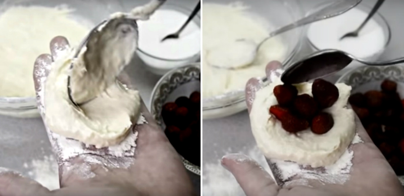 Na jedną dłoń nasypujemy mąki i nakładamy na nią łyżkę ciasta. Do środka wkładamy owoce, a palcami drugiej ręki prędko łączymy krawędzie.