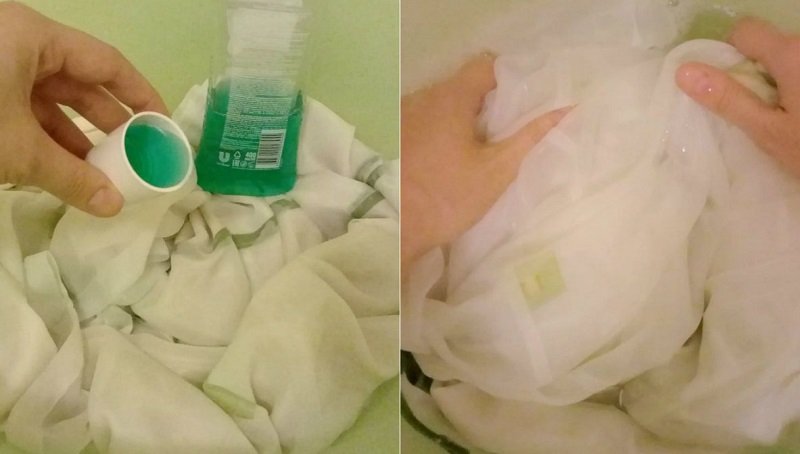 Najpierw dokładnie wytrzeb zasłony, aby pozbyć się nadmiaru kurzu. Wsadź je do głębokiego naczynia, na przykład wiadra i zalej zimną woda. Wlej do wody 30 ml płynu do płukania jamy ustnej i zostaw na dziesięć minut.