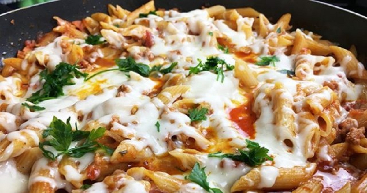 Pod koniec wrzucamy 300g makaronu penne lub kokardki i na małym ogniu gotujemy pod przykryciem mieszając co jakiś czas, aż makaron będzie miękki. Na koniec posypujemy świeżą bazylią i startym serem mozzarella i czekamy aż ser się rozpuści.
