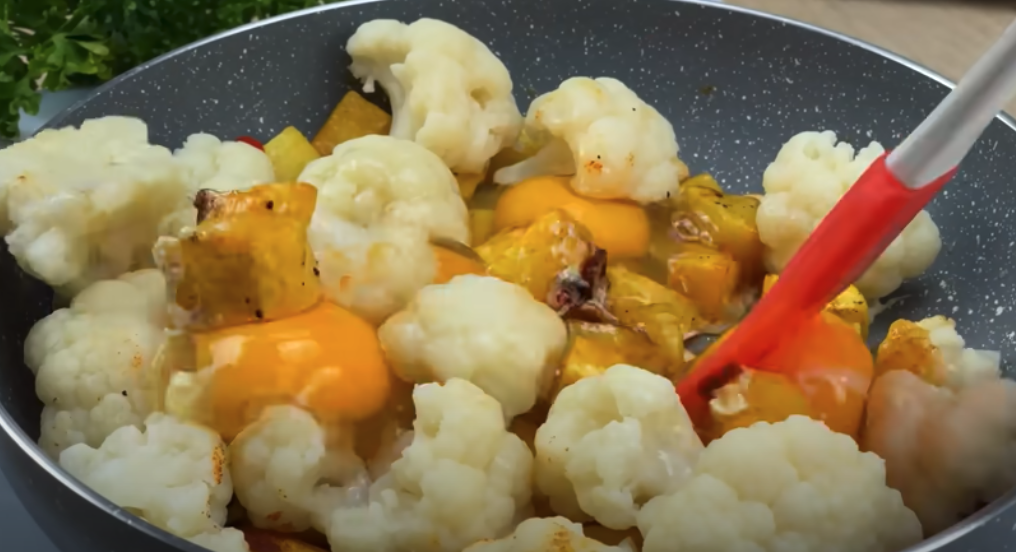 Dopraw mieszankę solą, pieprzem i odrobiną cukru. Kalafior i ziemniaki obtaczaj w mieszance mąki i krakersów. Rozgrzej olej na patelni. Smaż obtoczone kawałki kalafiora i ziemniaków na złoty kolor z każdej strony.