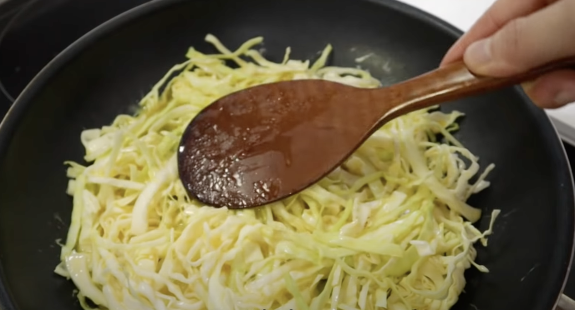 Warzywo zmieszane z jajkami należy piec pod przykryciem przez kilka minut. Później należy odwrócić kapustę na drugą stronę, posmarować sosem z pomidorów, posypać serem i dodać kiełbasę.
