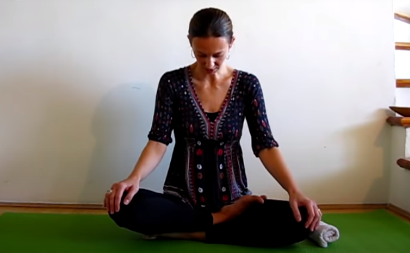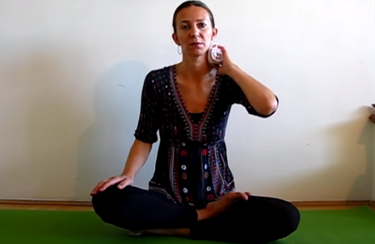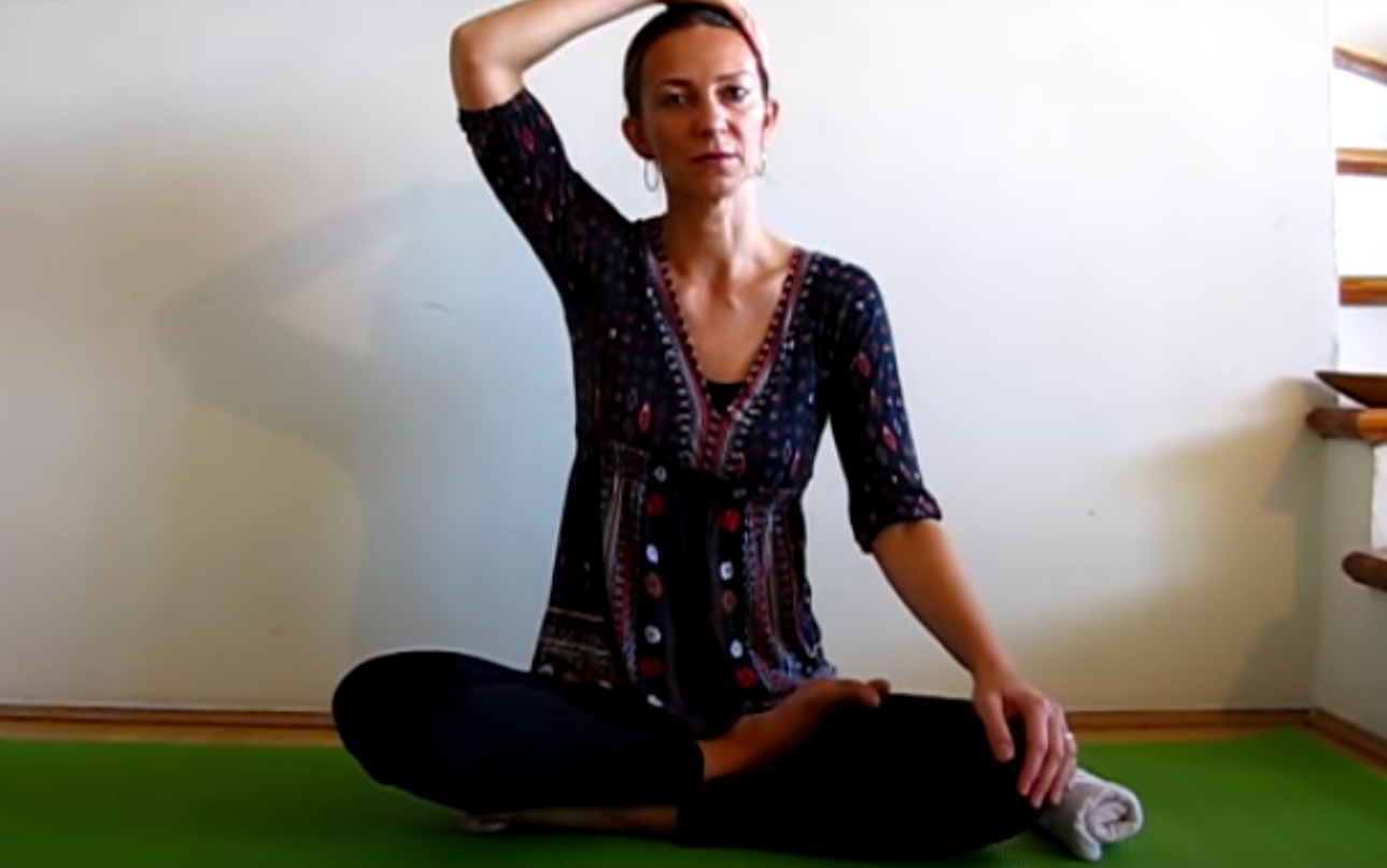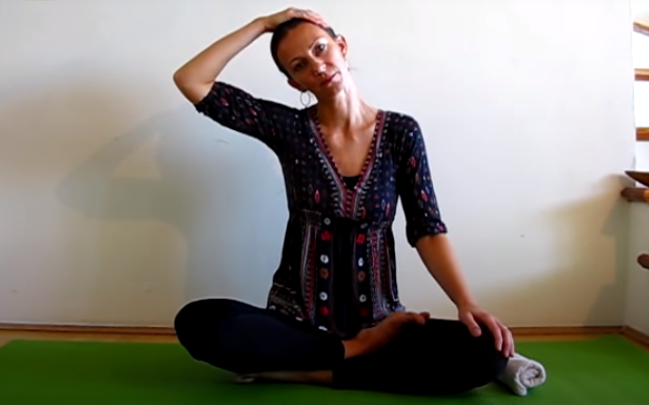 Siedząc po turecku prawą ręką obejmij głowę od góry tak, aby Twoja dłoń spoczywała na lewej skroni. Wdychając i wydychając powietrze powoli przechylaj głowę w stronę prawego ramienia.