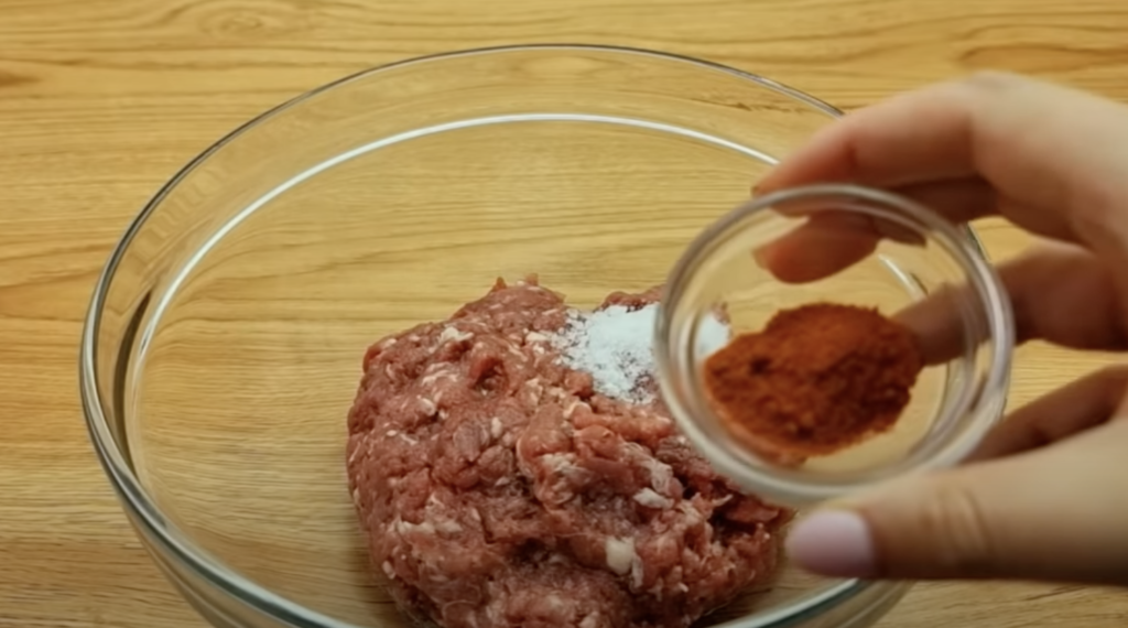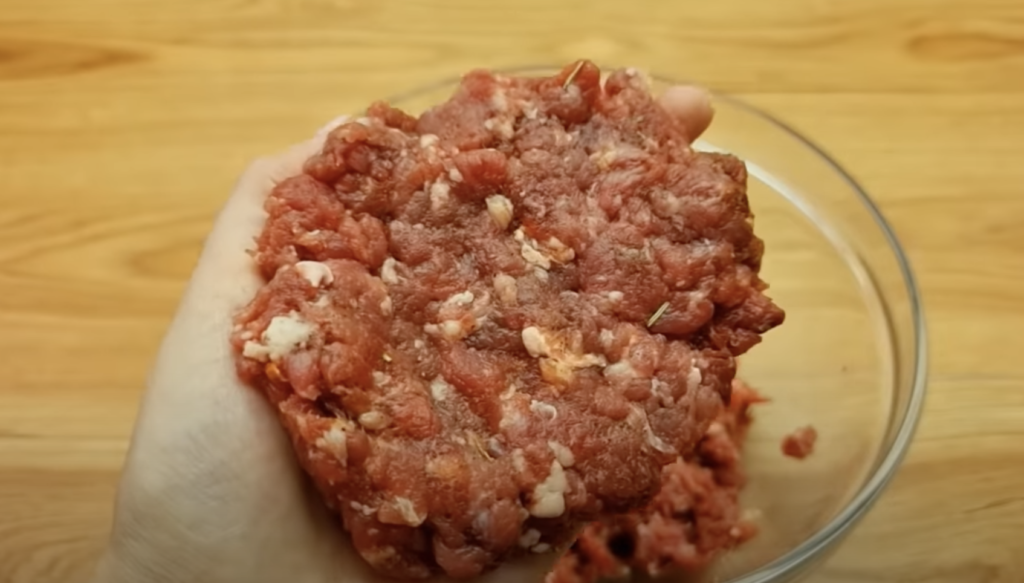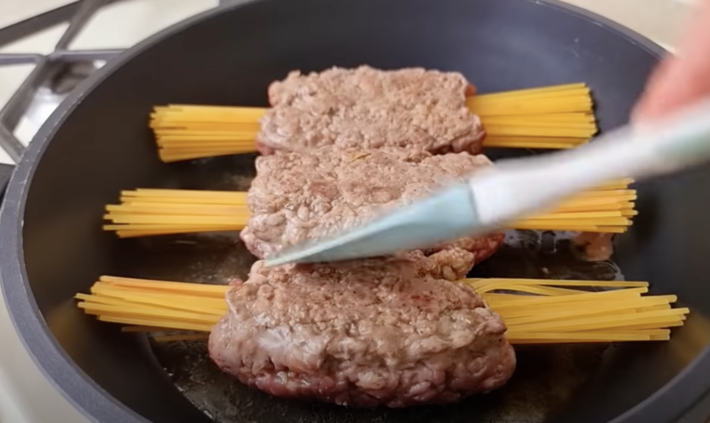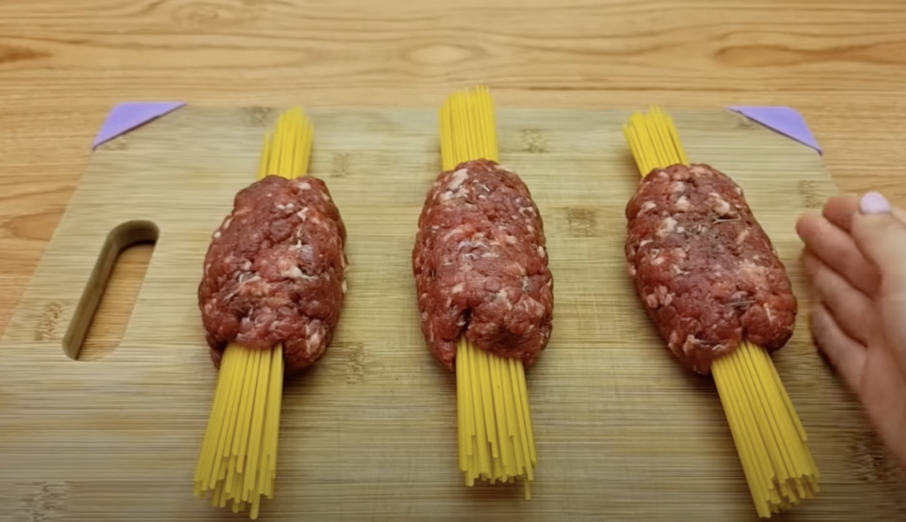 Weź garść makaronu spaghetti i owiń środek mięsem.