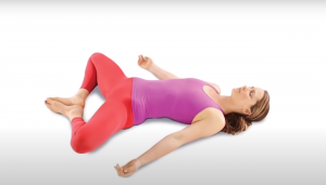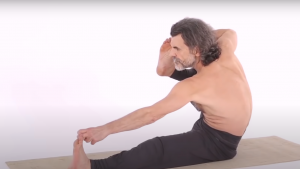 Usiądź na macie, nogi wyciągnij do przodu. Złap dłońmi za stopy. Pociągnij lewą nogę do lewego ucha tak, aby łokieć znajdował się za uchem. W tym czasie prawa noga musi leżeć płasko na ziemi. Pozostań tak przez 20-30 sekund. Jeśli na początku Ci się nie uda, nie przejmuj się. Postaraj się, a niedługo nabierzesz wprawy.