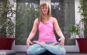 Usiądź na macie. Prawą stopę połóż na udzie lewej nogi, tak by kolano znajdowało się na podłodze. Powtórz czynność z lewą nogą. W prawidłowo wykonanej pozycji kolana i biodra znajdują się na podłodze, a stopy skierowane są na pępek.