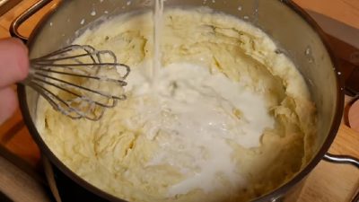 Do ziemniaków wlać ciepłe mleko, a następnie śmietanę. Za pomocą trzepaczki ubić owsiankę i dodać 2 łyżki masła.