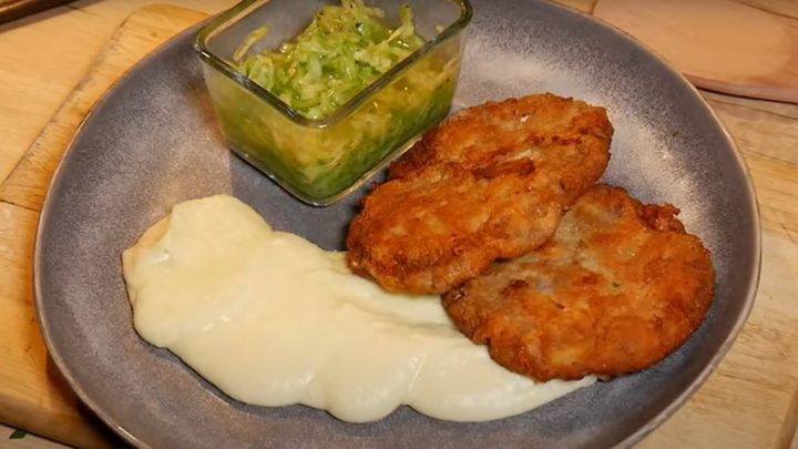 Z masy mięsnej uformować 2 kotlety o średnicy około 7-8 cm, każdy z nich panierować w mące, następnie w roztrzepanym jajku z solą i na koniec w bułce tartej. Smaż kotlety przez około 4 minuty z każdej strony. Wskazówka: Kotlety z mięsa mielonego podawaj z przygotowanym puree ziemniaczanym i sałatką z ogórków.
