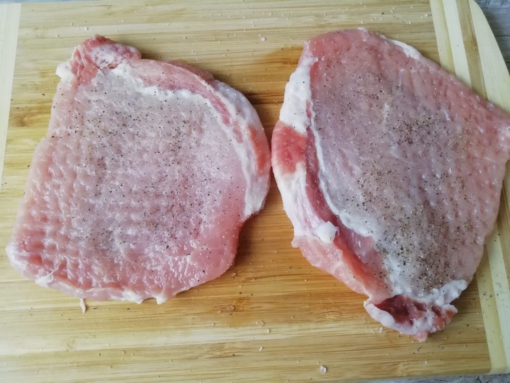 Posolić i posypać mięso czarnym pieprzem z obu stron i rozetrzeć w dłoniach. Cebulę kroimy w grubsze krążki i układamy na blasze wyłożonej papierem do pieczenia.