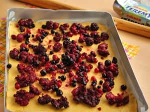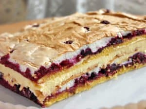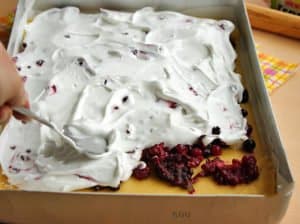 Ubij 4 białka z cukrem i stopniowo dodawaj skrobię – do uzyskania gładkiej masy. Uzyskaną masą posmaruj powierzchnię ciasta i piecz przez 40 minut w temperaturze 180 stopni.