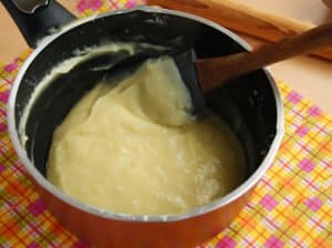 Wymieszaj cukier, mąkę, skrobię i żółtko w mleku i ugotuj z nich gęsty krem budyniowy.