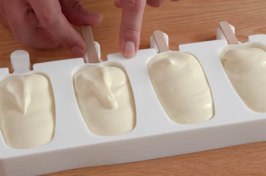 Przełóż gotowy krem do foremek na lody i wstaw do lodówki na kilka godzin, aż masa stężeje i będzie dobrze schłodzona.