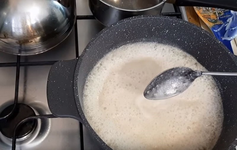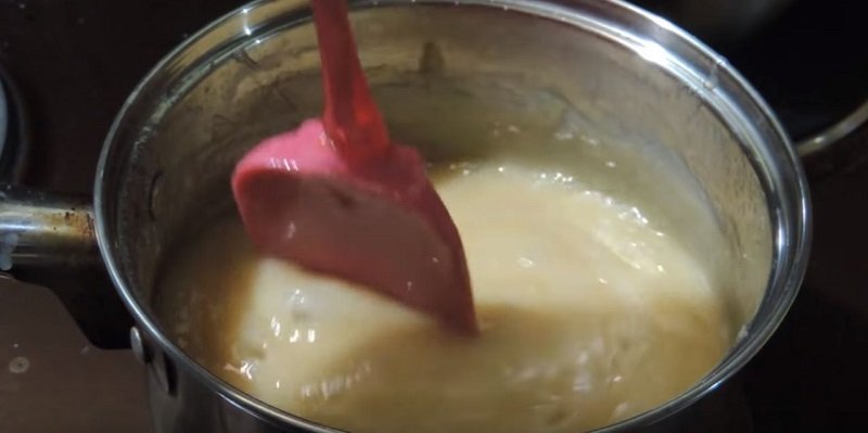 Gdy się rozpuści dodaj masło i dopiero całość wymieszaj. Na innym palniku podgrzej mleko i wlej do cukru z masłem. Wszystko wymieszaj.