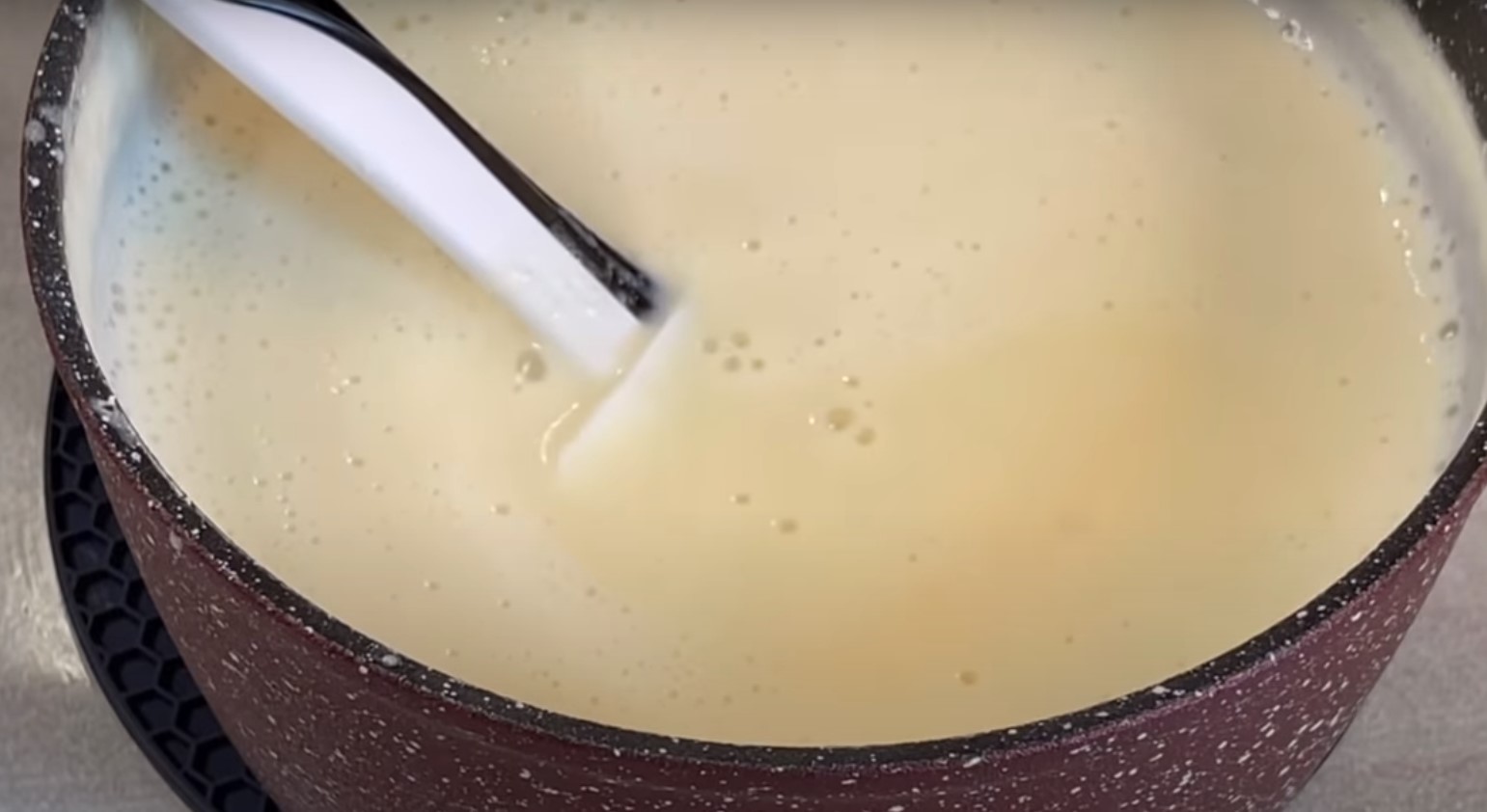 Powstałą masę przepuszczamy przez sitko do garnka, dodajemy budyń oraz skrobię. Następnie mieszamy i gotujemy do 2 minut, stale mieszając.