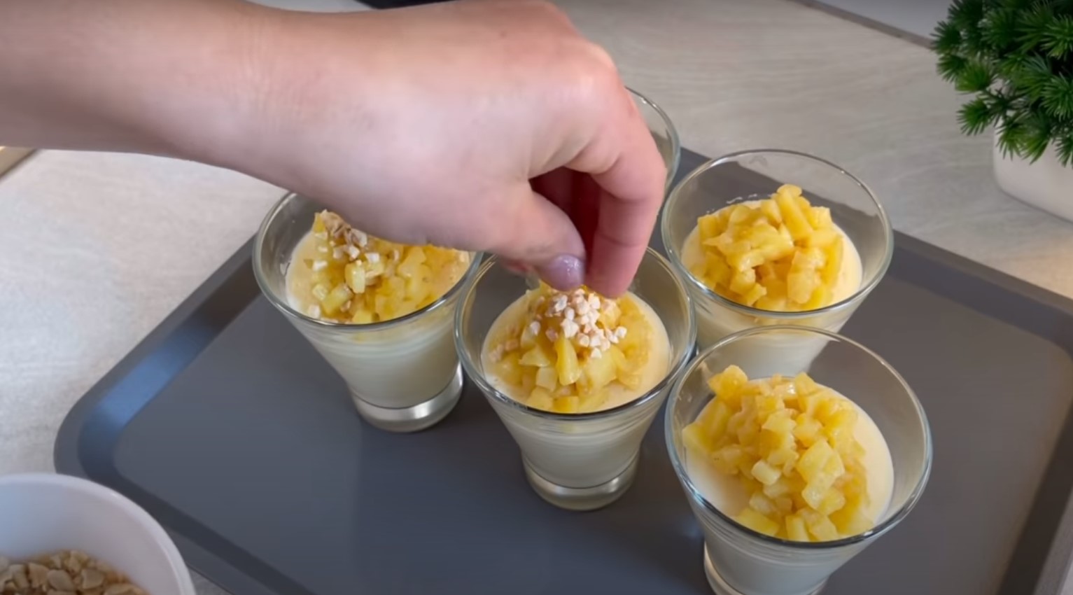 Wlewamy masę do szklanych pucharków, by ostygła. Po ostudzeniu wkładamy pucharki do lodówki na ok. 2 godziny. W tym czasie możemy przygotować dekorację.