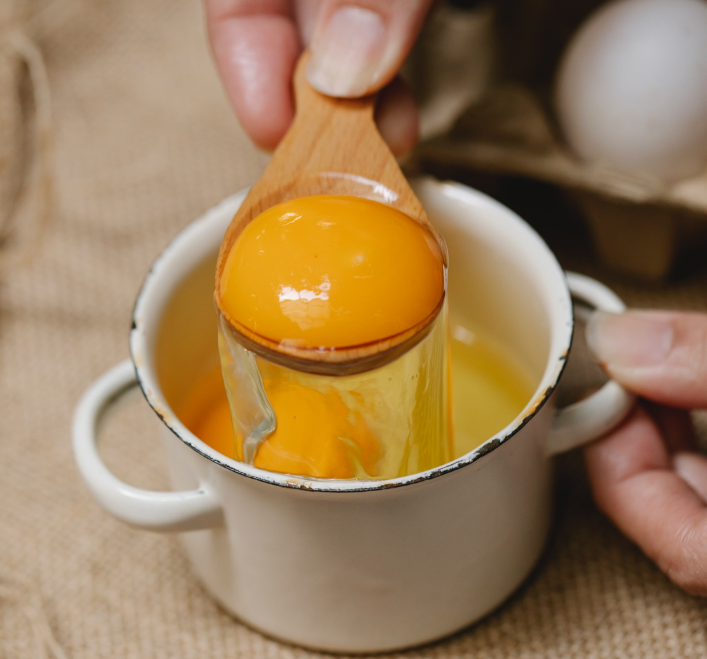 Na początek rozdzielamy żółtka od białek. Do garnka z żółtkami dodaj cukier, cukier waniliowy. Ubij trzepaczką.