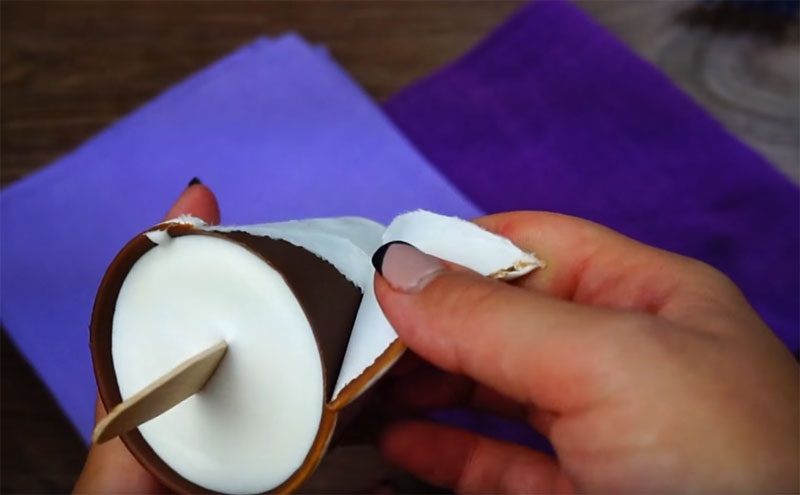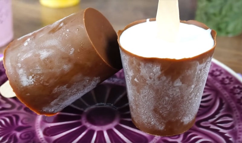Wyjmij kubeczki z zamrażarki. Do tak przygotowanych wlej miksowaną wcześniej masę ze śmietanki i mleka. W środek każdego loda wsadź drewniany patyczek. Włóż przygotowane lody do zamrażarki na minimum 5 godzin.