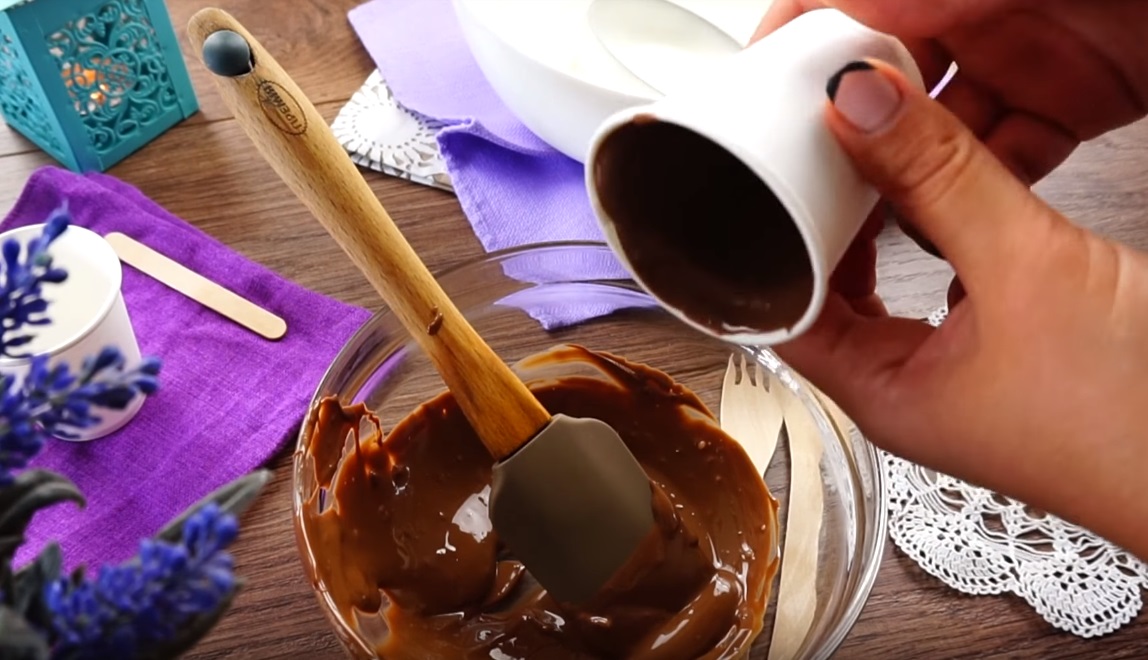 W osobnym naczyniu rozpuść czekoladę w kąpieli wodnej, możesz roztopić ją również w mikrofalówce. Roztopioną czekoladę wlej do kubeczków i rozprowadź ją po ściankach, aby tworzyła polewę lodów.