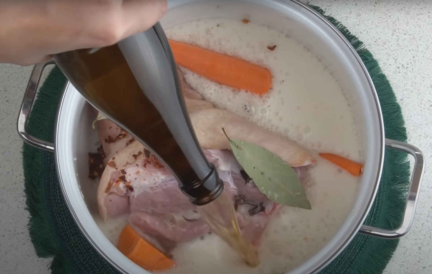 Golonkę włóż do garnka, dodaj liść laurowy, jagody jałowca, goździki, obraną cebulę, łodygi pietruszki i anyż. Następnie włóż obraną marchewkę pokrojoną w mniejsze kawałki, dodaj sól, dodaj chili i zalej wszystko 500 ml piwa.