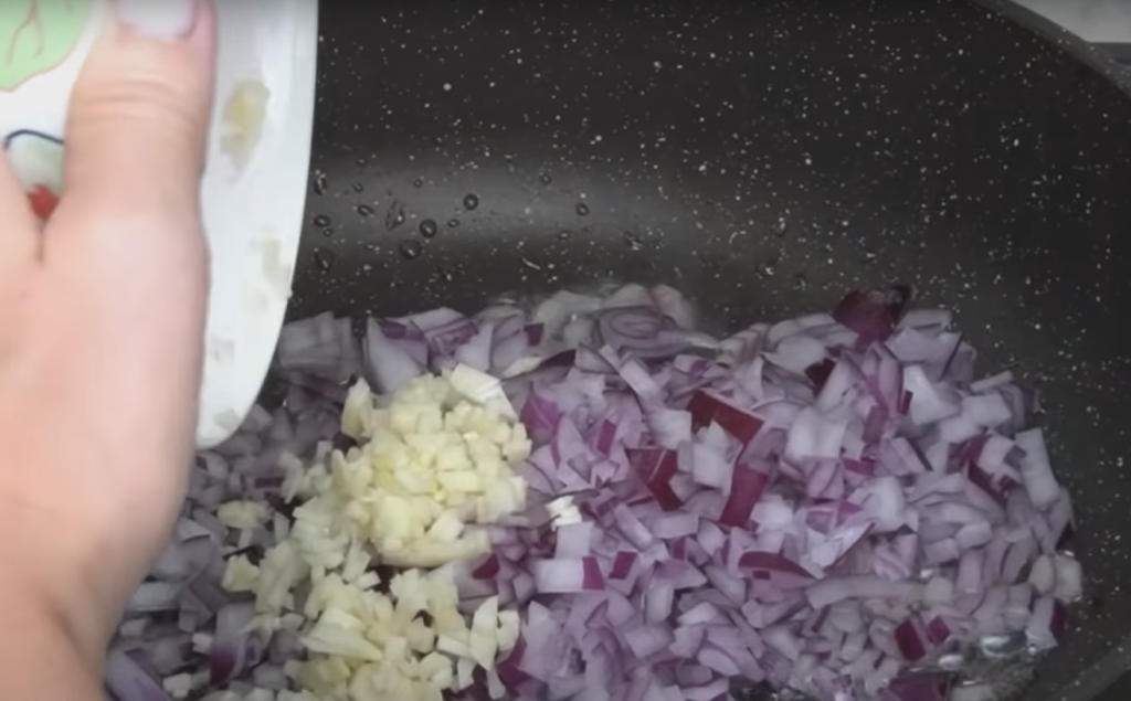 Na koniec dolać wody tak, aby garnek był pełny. Kładziemy na kuchence na umiarkowane ogrzewanie, przykrywamy pokrywką i gotujemy około 2 godzin. W międzyczasie pokrój wędzony brzuch (lub boczek) i na rozgrzanej patelni z olejem podsmaż drobno posiekaną cebulę z posiekanym czosnkiem.