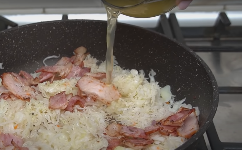 Kapustę kiszoną odsączyć z nadmiaru wody i ułożyć ją na podsmażonej cebuli wraz z pokrojonym w plasterki boczkiem. Doprawić, dodać kminek i zalać 200 ml piwa.