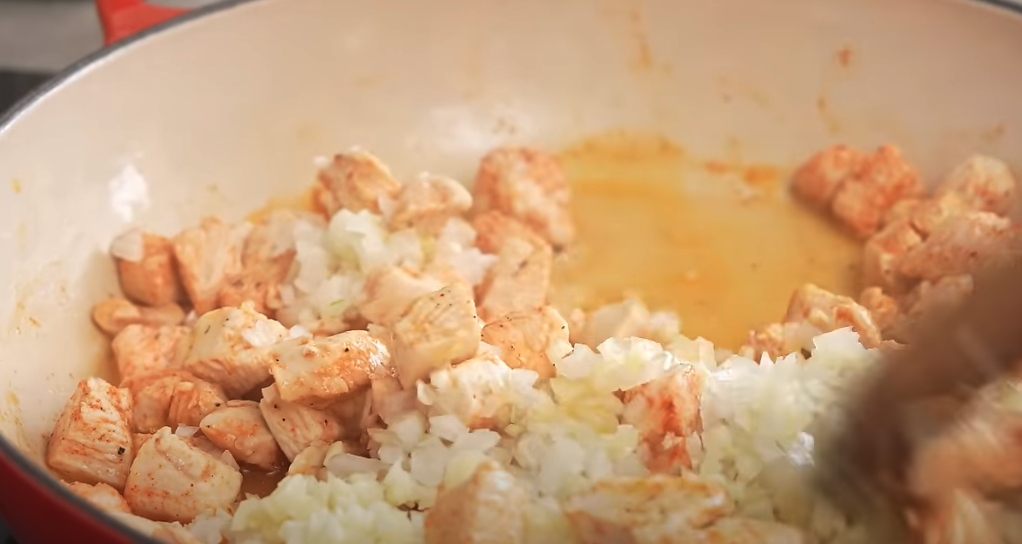 Na tej samej patelni, na której smażył się kurczak, dodaj posiekaną cebulę i czosnek. Smaż przez około 2 minuty, aż będą miękkie i lekko złociste. Do cebuli i czosnku dodaj 1 łyżkę mąki i smaż przez minutę, aby pozbyć się surowego smaku mąki. Następnie stopniowo dodawaj bulion drobiowy, cały czas mieszając, aby uniknąć grudek. Dodaj śmietankę kremówkę i mieszaj, aż sos zgęstnieje.