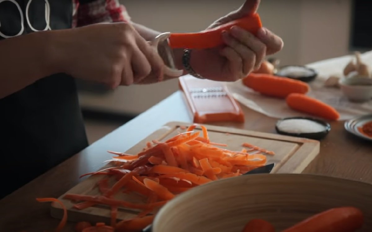 Najpierw obierz marchewki i zetrzyj je na specjalnej tarce. Taka tarka nazywana jest niszczarką lub tarką do koreańskiej marchewki.