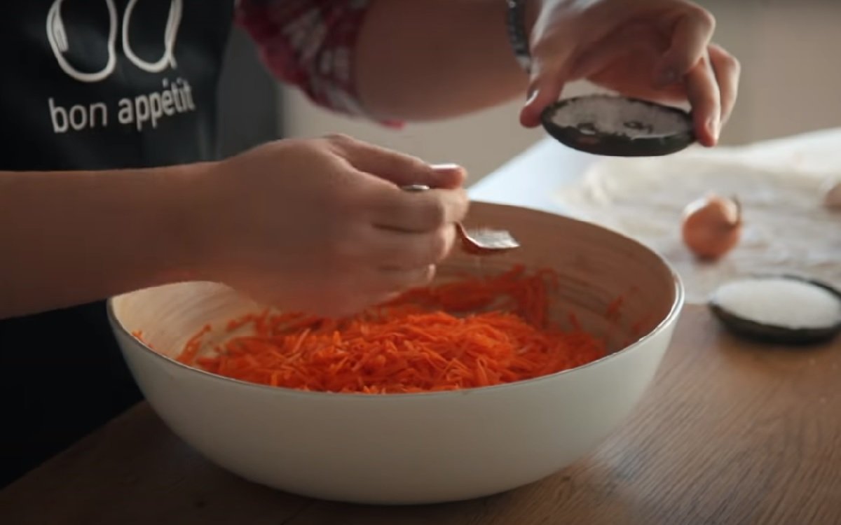 Około kilograma marchewki będzie potrzebować jednej łyżeczki soli i pół łyżeczki cukru. Włożyć startą marchewkę do głębokiej miski, posolić i posypać cukrem.