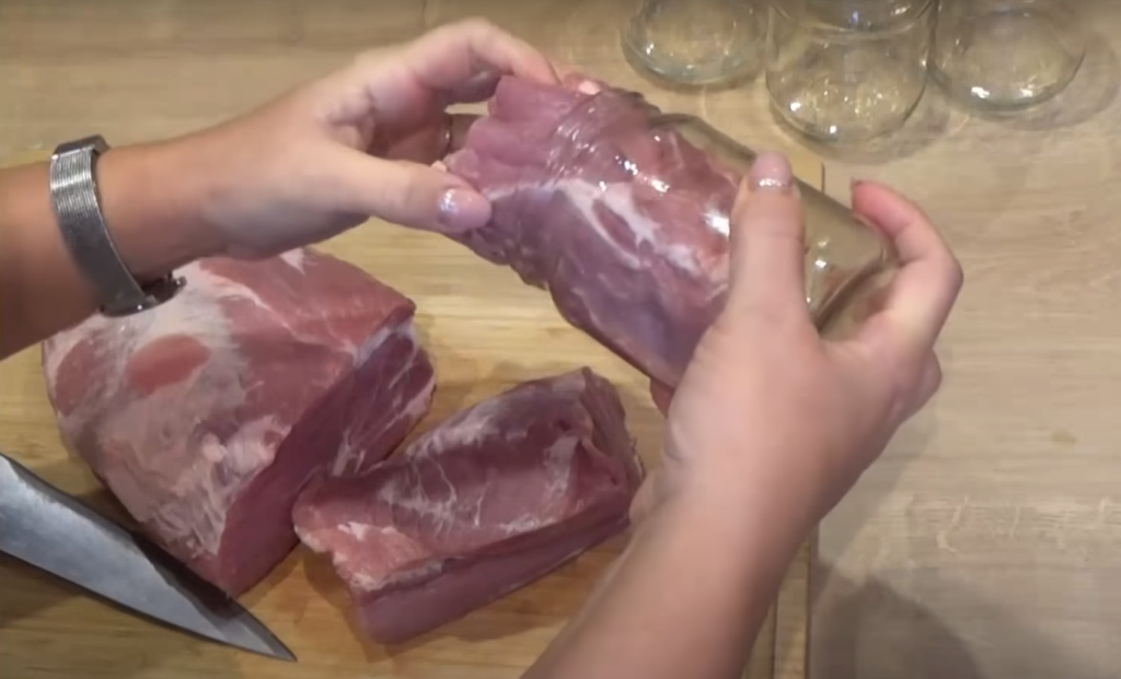 Przygotujemy wysterylizowane słoiki i przystąpimy do obróbki mięsa. Mięso kroimy do takich rozmiarów, aby zmieściło się w naszych słoikach.