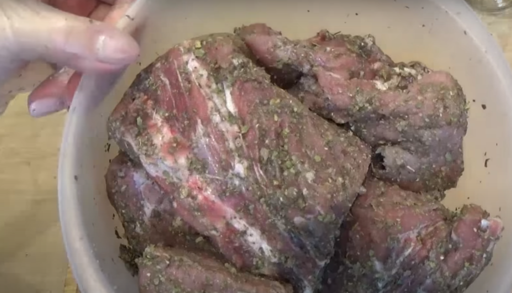 Przykryj miskę z mięsem i przechowuj w lodówce przez 2 dni. Po tym czasie mięso wkładamy do słoików i zakręcamy. Połóż bawełniany ręcznik na dnie dużego garnka. Na nim kładziemy przygotowane słoiki i zalewamy wodą do 3/4 wysokości słoika.