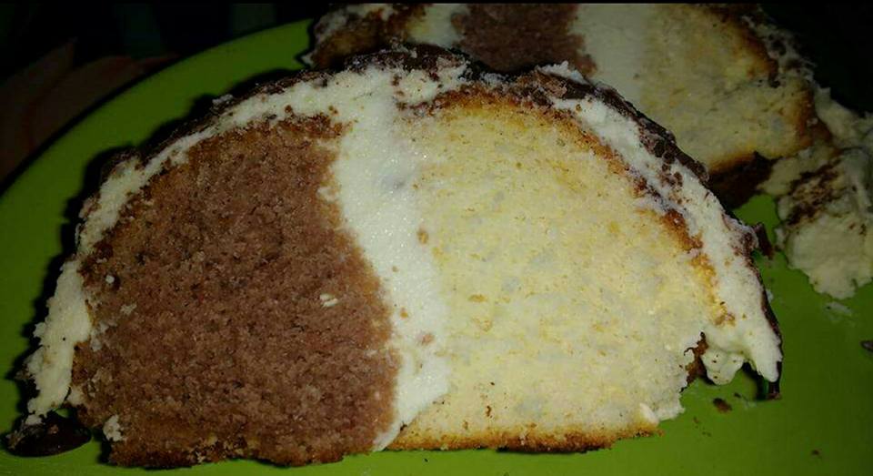 5. Przy użyciu przygotowanego kremu, składaj na przemian paski jasnego i ciemnego ciasta. Na wierzch i boki możesz nałożyć odrobinę kremu.