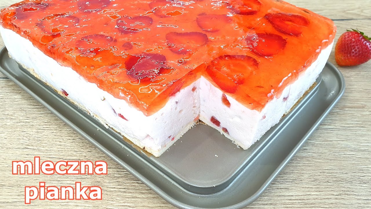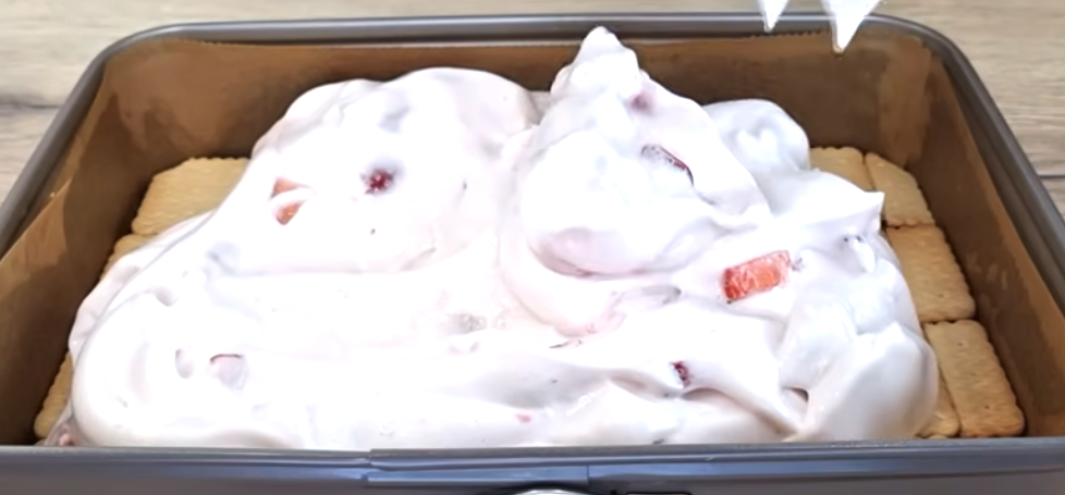 Umyj i pokrój na połówki lub ćwiartki 300 g truskawek. Rozłóż je równomiernie na warstwie herbatników. Wylej masę mleczno-galaretkową na herbatniki i truskawki, tak aby pokryły całą powierzchnię. Wstaw formę do lodówki na kilka godzin, aż masa dobrze się schłodzi i stężeje.