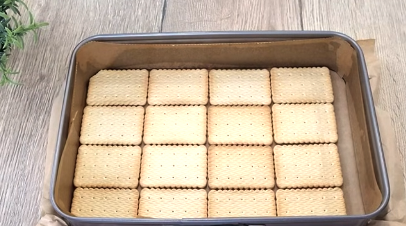 W dużej misce wymieszaj 500 ml niesłodzonego mleka zagęszczonego z przestudzoną galaretką. Mieszaj, aż masa będzie jednolita. Na dno formy (np. tortownicy) ułóż warstwę herbatników, aby pokryły całe dno.