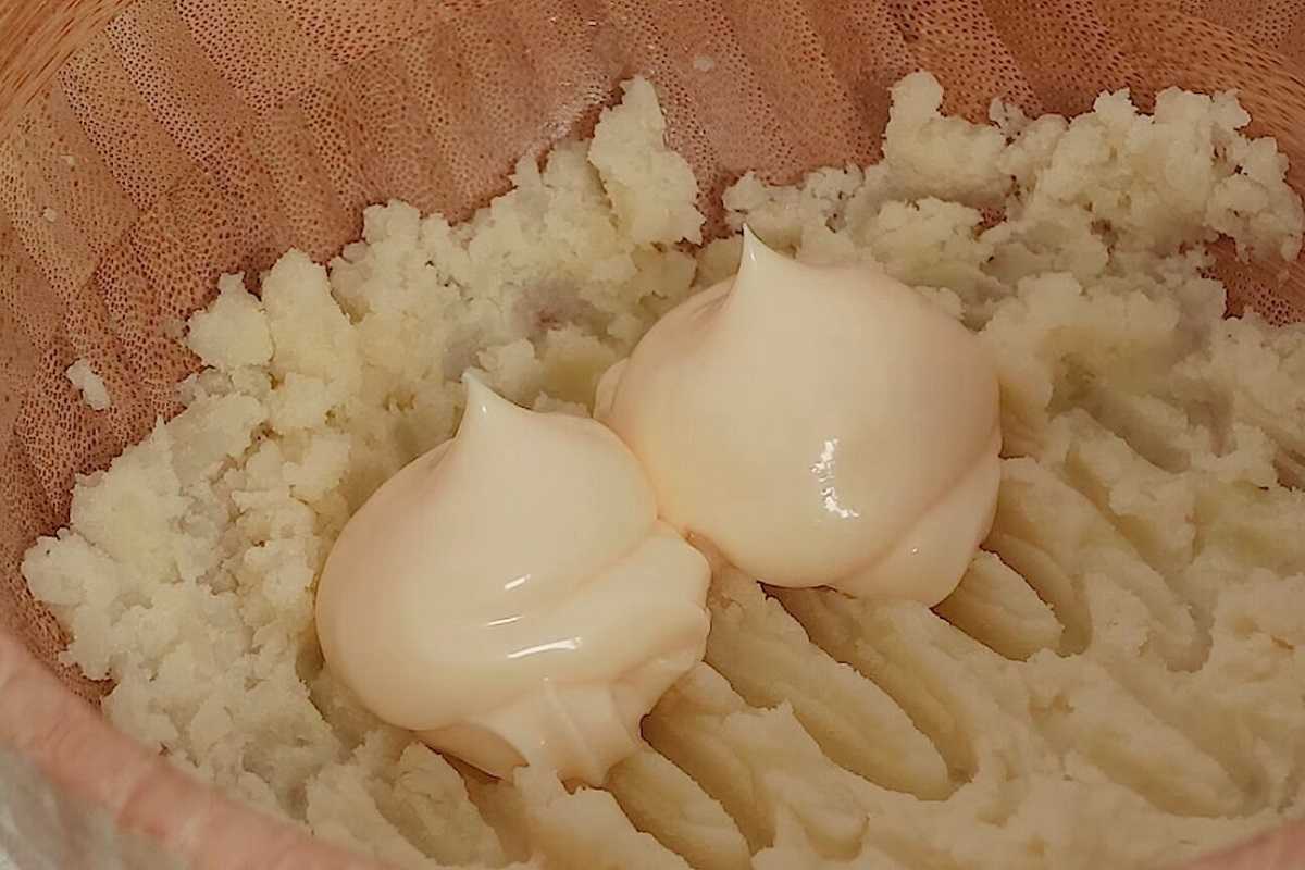 Ziemniaka zetrzyj i wymieszaj z majonezem. Po godzinie wyjmij ciasto z lodówki i rozwałkuj je.