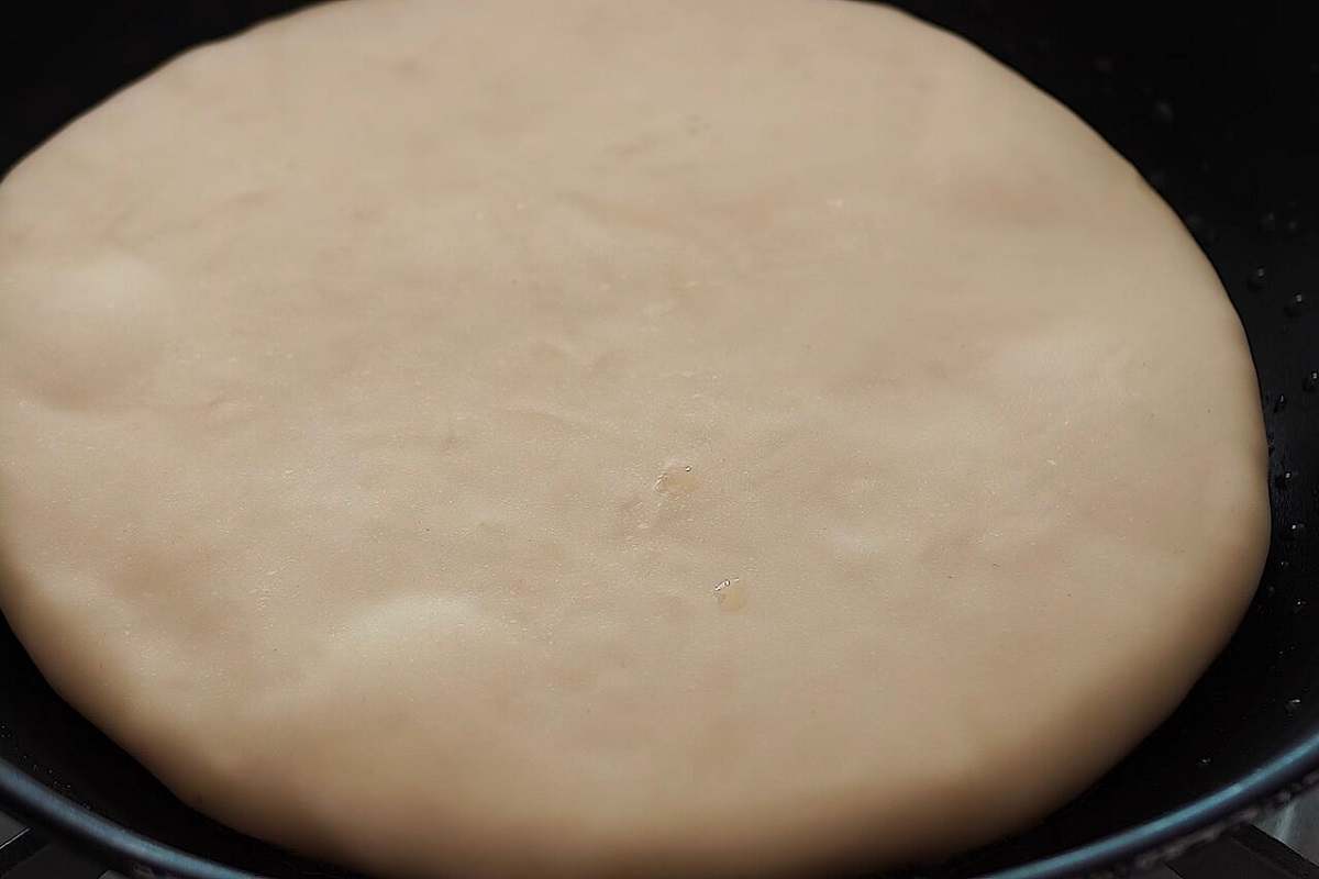 Na patelni rozgrzej olej i połóż placek. Smaż go z obu stron na złocisty kolor.