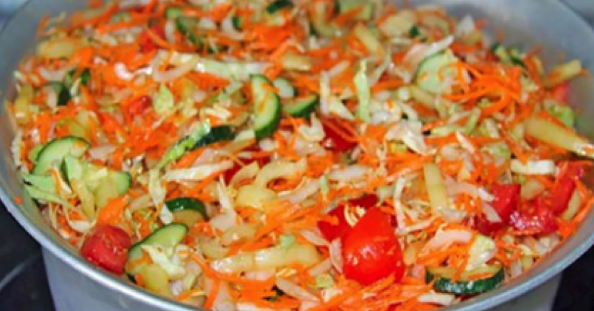 Zacznij od pokrojenia wszystkich składników w paski. Następnie dodaj olej, ocet, cukier i sól, po czym dokładnie wymieszaj. Pozostaw sałatkę na 1 godzinę. Potem, przesuń ją do garnka i postaw na ogniu. Po zagotowaniu, gotuj nie dłużej niż 10 minut.