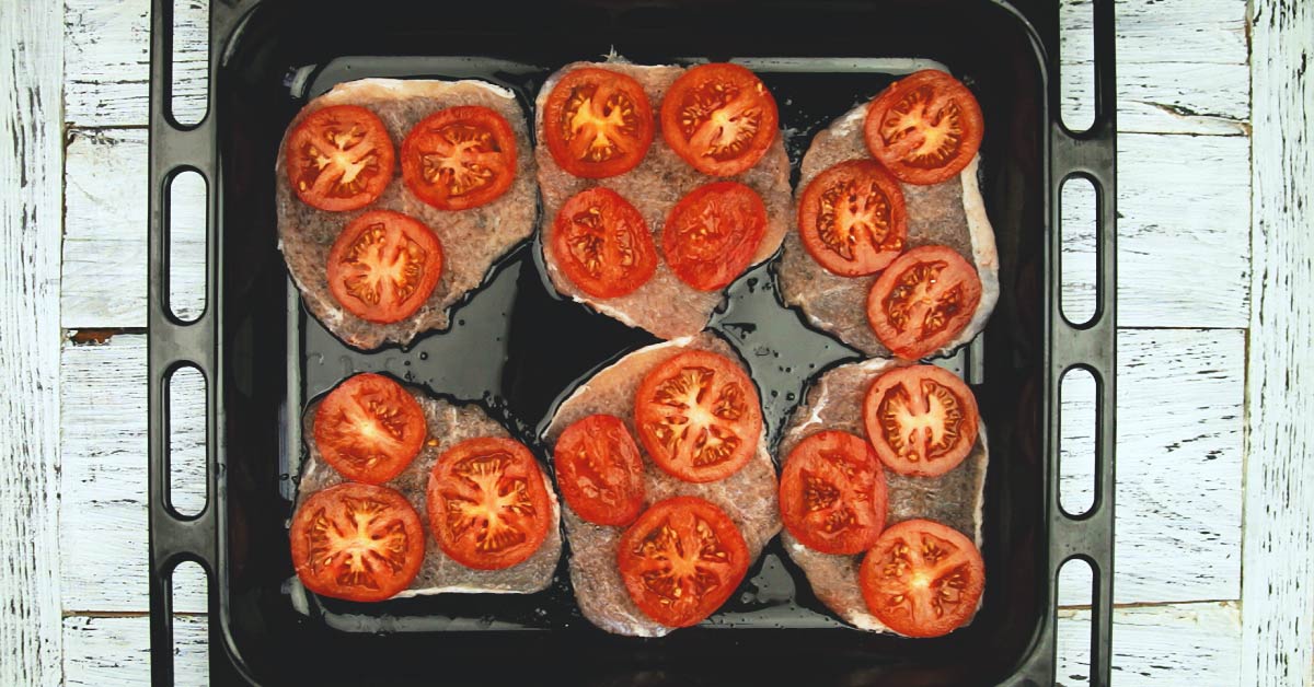 Pokrojenie cebuli w krążki i pomidora w plasterki. Ułożenie na blasze wyłożonej papierem do pieczenia cebuli, na niej kotletów, posmarowanie mięsa musztardą i ułożenie krążków pomidora, posmarowanych posiekanym czosnkiem, solą i pieprzem.
