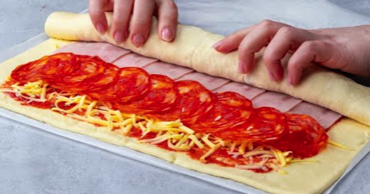 Ciasto uformuj w cienki prostokąt, wysmaruj go przecierem pomidorowym – posyp oregano, tartym serem i ułóż rzędy salami, i szynki a w drugim rzędzie ponownie ułóż salami. Całość zwiń w elegancki rulon.